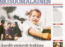 kurdit etenevät Irakissa. Jorma Tuomi-Nikula. Liittoutuman hyökkäys Irakiin on menettämässä voimaansa. Ainoat joukot, jotka sunnuntaina pystyivät etenemään, olivat kurdien peshmerga-taistelijat, jotka lähestyvät kurdien pääkaupunkinaan pitämää Kirkukia. Bagdadiin pyrkivät amerikkalaiset näyttävät ryhmittyvän jopa viikkoja kestävään puolustukseen. Basraa piirittävät britit sanovat ottaneensa 30 vankia ja tappaneensa saman verran Irakin sotilaita. Basran sanotaan silti yhä olevan irakilaisjoukkojen hallussa. Basran miljoonakaupungin asukkaat kärsivät jo vakavasta vesi- ja elintarvikepulasta. Tuhannet pakenevat taisteluja maalle. Luvatut elintarvikelähetykset ovat olleet vähäisiä ja suurin osa on avustusjärjestöjen mukaan joutunut vääriin käsiin. Bagdadin puolustajat ovat saamassa avukseen itsemurhatehtäviin sitoutuneita arabeja. Irakin armeijan mukaan noin 4 000 taistelijaa on jo saapunut Jordaniasta Bagdadiin. Eräs heidän ykköstehtävistään on liittouman huoltokuljetusten häirintä. Sodan vuoksi eronnut Britannian ex-ulkoministeri Robin Cook hyökkäsi sunnuntaina voimakkaasti pääministeri Tony Blairin ja presidentti George W, Bushin sotapolitiikkaa vastaan. Hänen mielestään brittijoukot olisi heti kutsuttava kotiin. Ulkomaat 12-13. Keskisuomalainen maanantaina 31.03.2003. | |